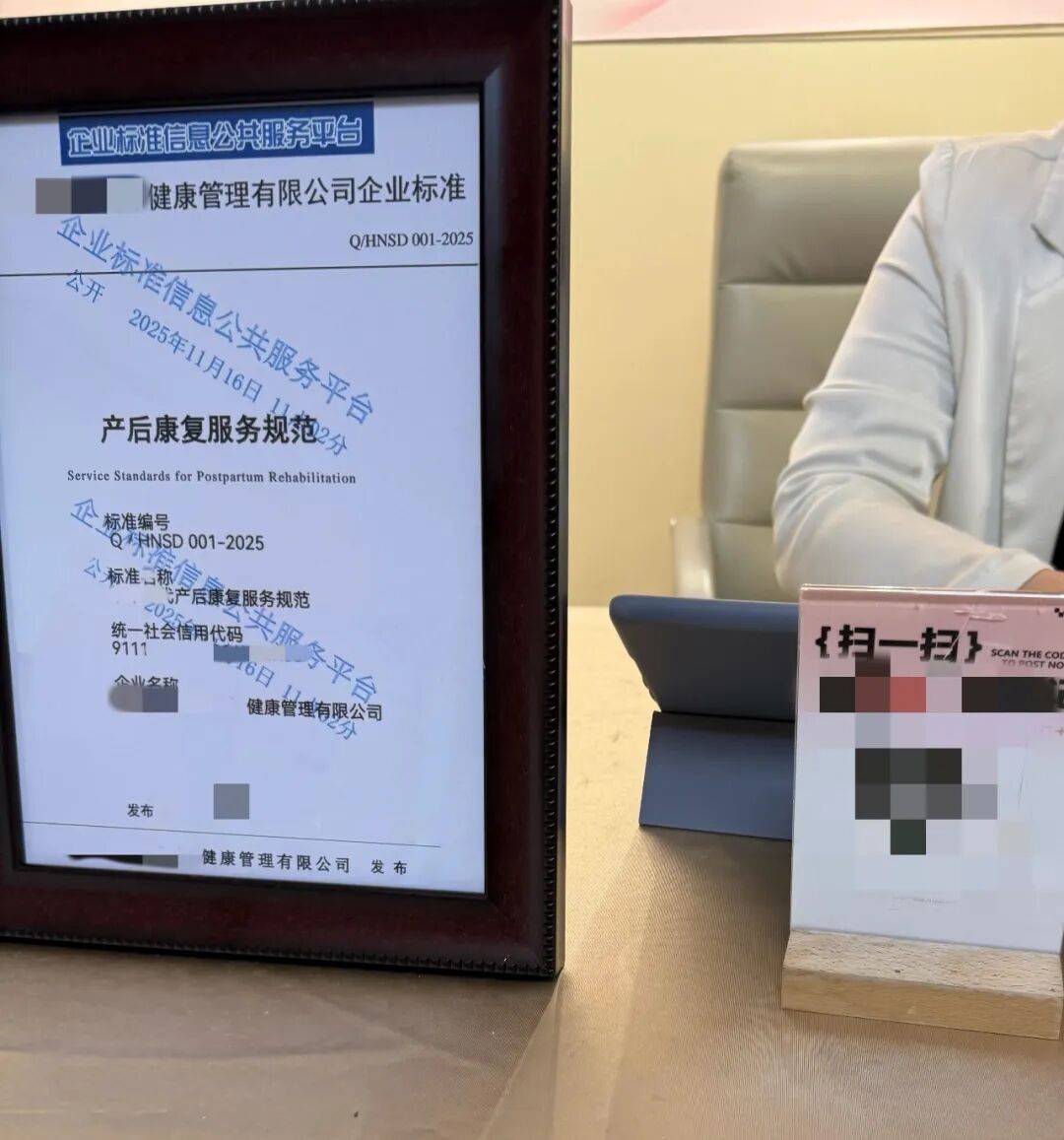 ▲北京朝阳区某产后修复机构公示的营业信息及产后康复服务规范,实际上,该机构并未获得相应医疗许可资质。 图/新京报记者 咸运祯 摄